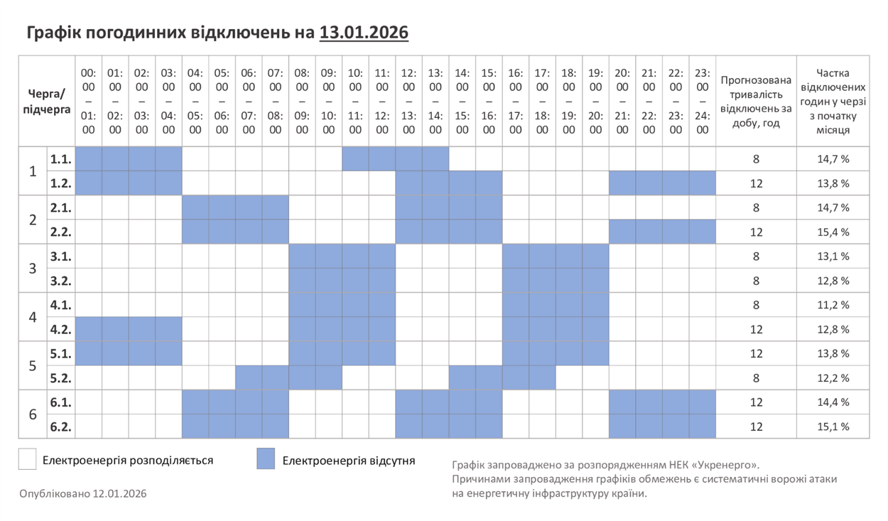 Вимкнення електроенергії у більшості підгруп стали довшими - частина абонентів буде без світла по 12 годин, решта ж по 8 годин.