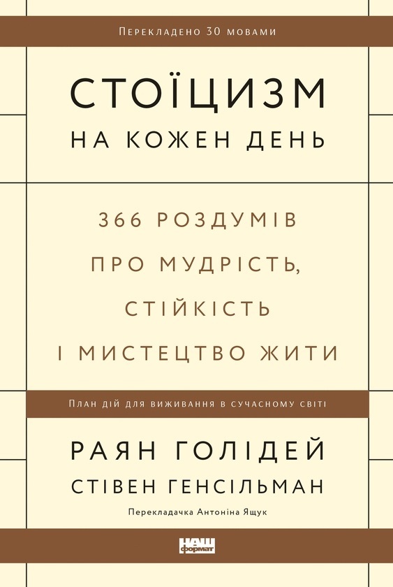 Це практичний посібник для тих, хто прагне виробити внутрішню незламність. Книга побудована у форматі щоденника: на кожен день року – одна коротка настанова від класиків стоїцизму. Читач знайомиться з мудрістю Сенеки, Епіктета та Марка Аврелія, яка навчає концентруватися на важливому та зберігати спокій навіть у найскладніших обставинах.
